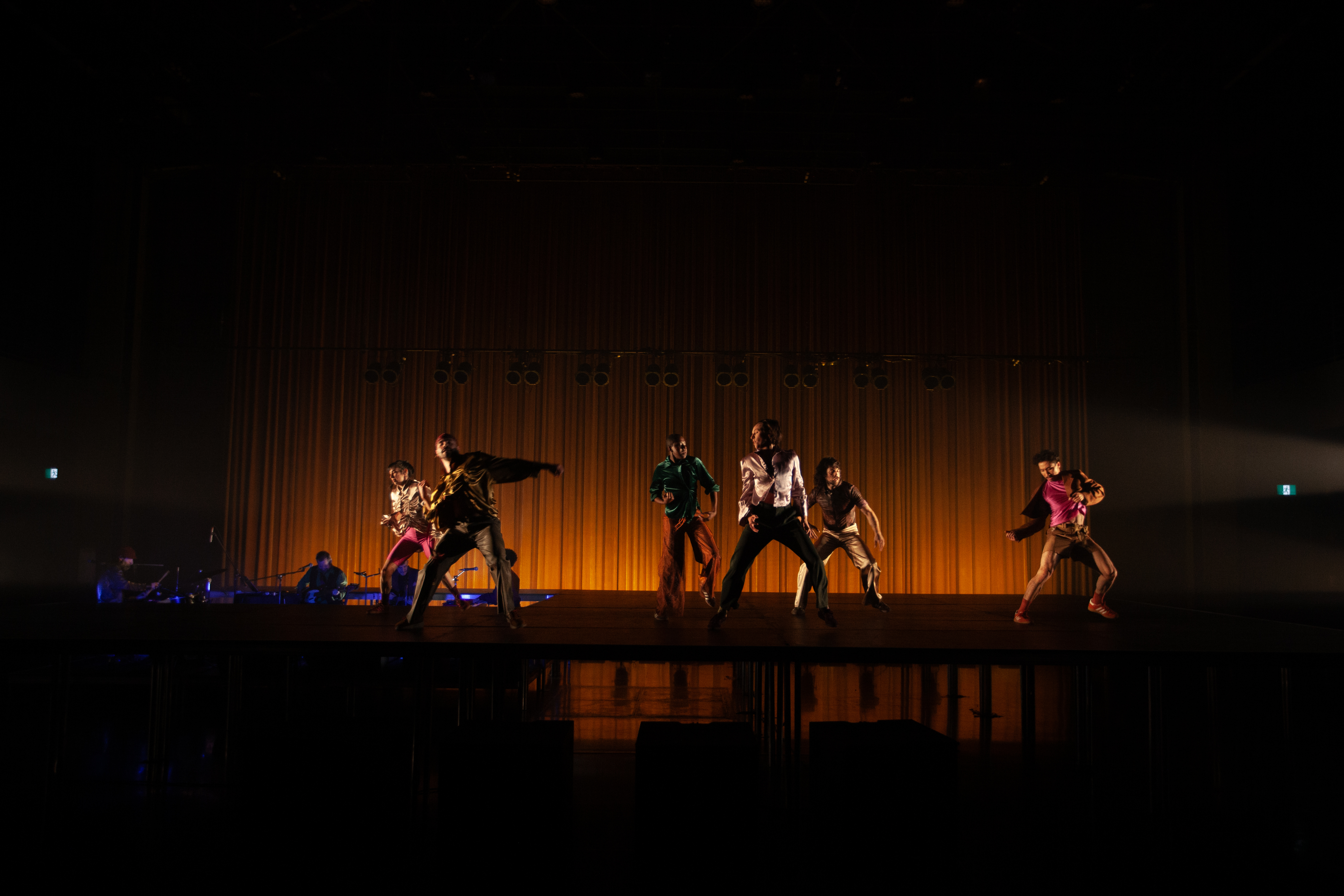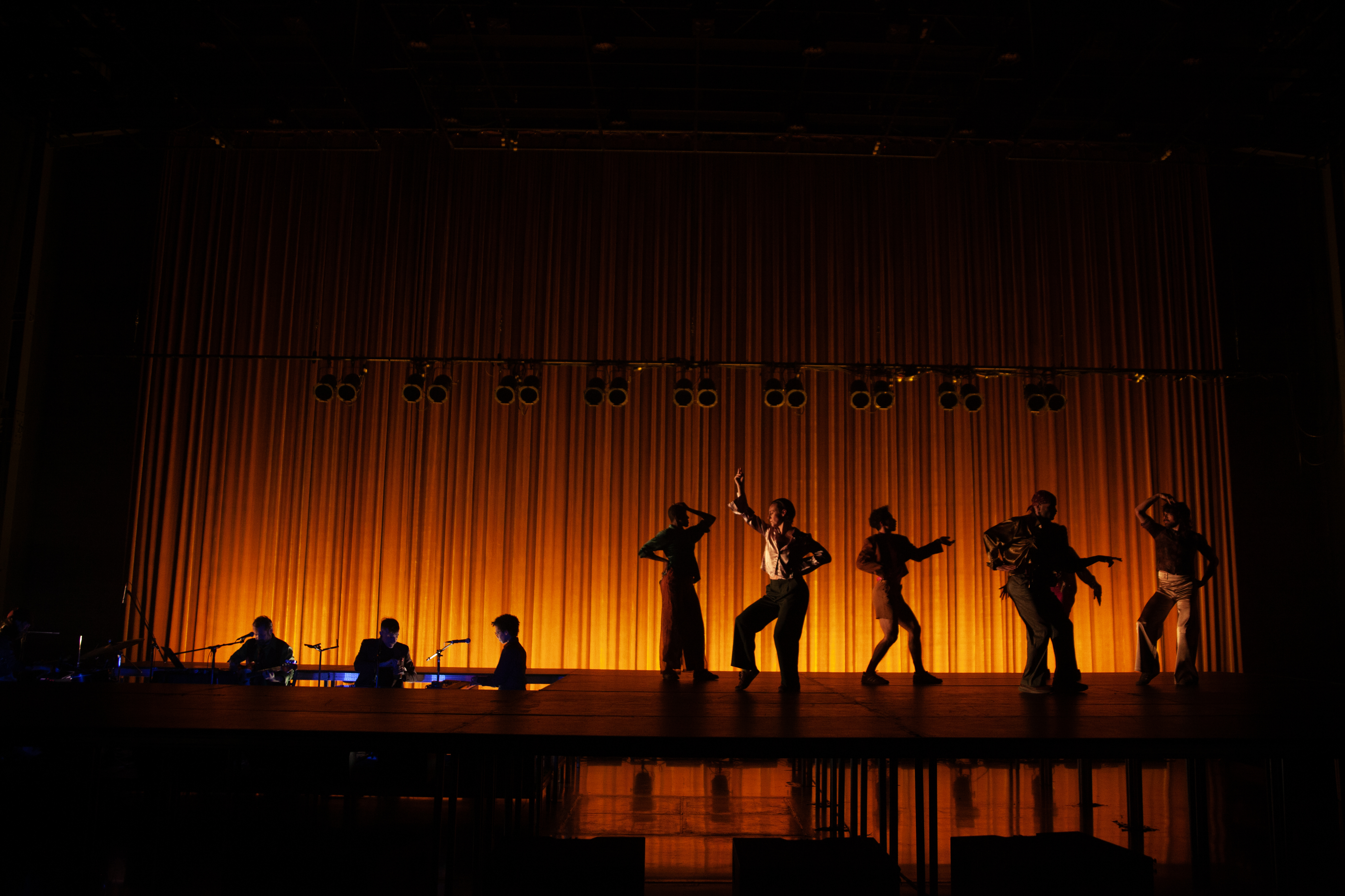 Atmosphère trouble où le temps est étiré et lancinant. Quatre musiciens, dont Frédérick Gravel lui-même, saturent l’espace de musiques et de chants hypnotiques et mélancoliques, un puissant mélange d’influences passées et actuelles qui nous envoûte. Six interprètes, parfois couples, parfois solitudes, habillés de vêtements à la fois opulents et de fortune, bougent, dansent, s’approchent l’un de l’autre, s’accrochent, tentent la séduction. Ils et elles arpentent inlassablement ce salon suspendu et nous plongent dans un long voyage vers la nuit, là où il n’y a plus d’heures ou de matin qui pointe à l’horizon. Plane cette indicible tristesse d’être au monde, suinte cet effort salutaire de poursuivre lorsque le naufrage des sentiments est arrivé.